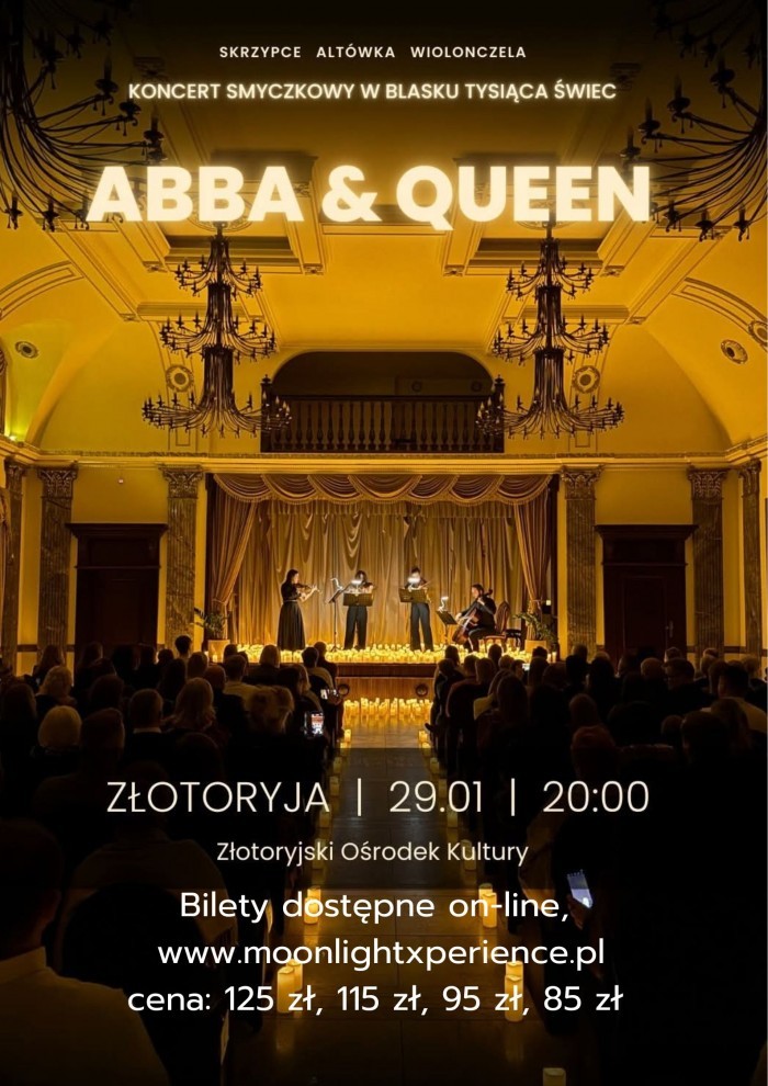 Zapraszamy na wyjątkowy wieczór pełen muzycznych emocji, nostalgii i niezapomnianych przebojów w kameralnej atmosferze rozświetlonej setkami świec. Kwartet smyczkowy wykona poruszające aranżacje największych hitów zespołów ABBA i Queen – od energetycznych „Don’t Stop Me Now” i „Dancing Queen”, przez romantyczne „Slipping Through My Fingers” i „The Winner Takes It All”, po epickie „Bohemian Rhapsody” i „Who Wants to Live Forever”.