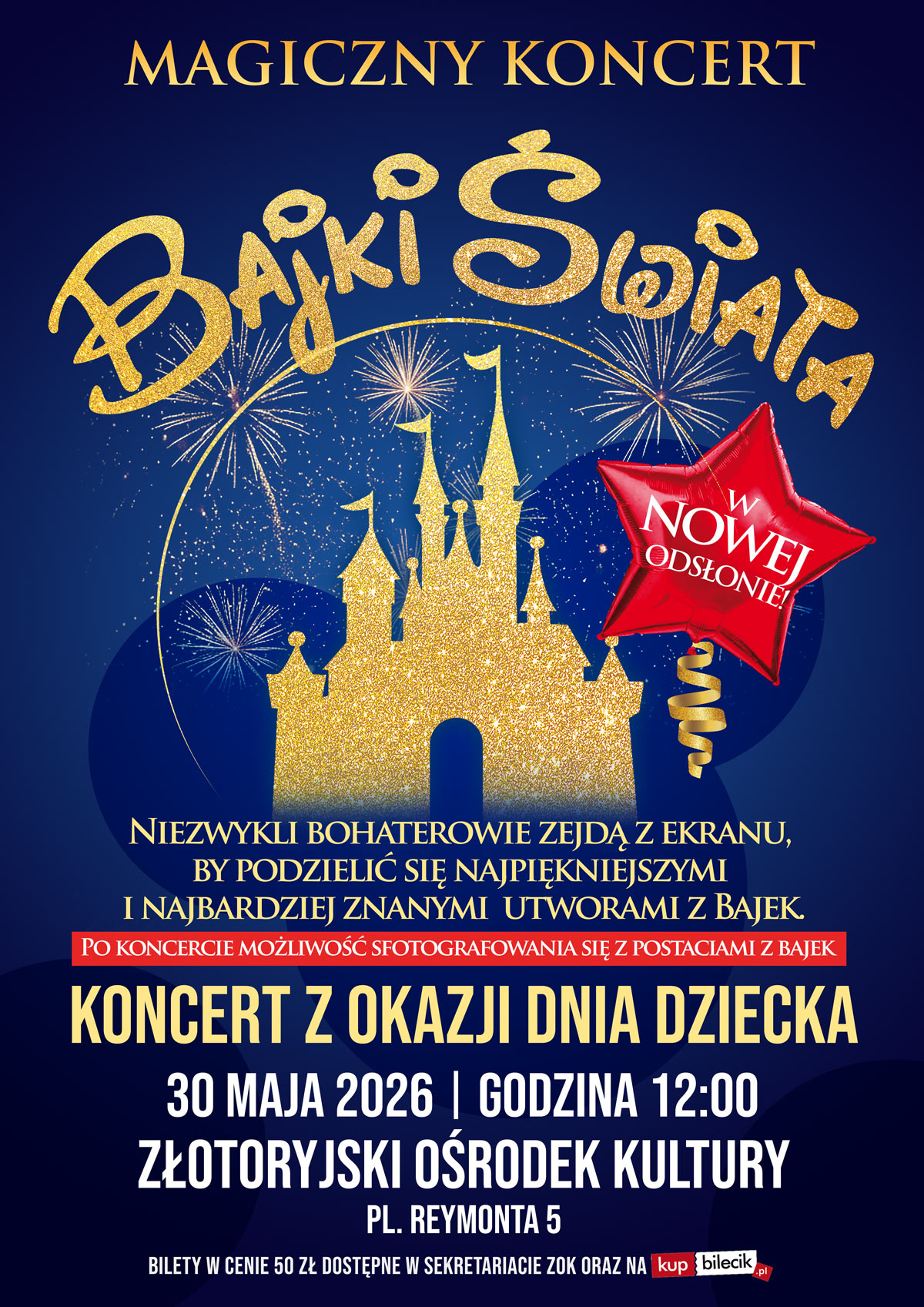 Opis grafiki: Plakat zaprasza dzieci do udziału w koncercie „Bajki Świata”. Na niebieskim tle umieszczono złotą grafikę przedstawiającą zamek z bajek W. Disneya oraz tytul koncertu. Poniżej znajdują się szczegółowe informacje o wydarzeniu – złotą i biała czcionka.
