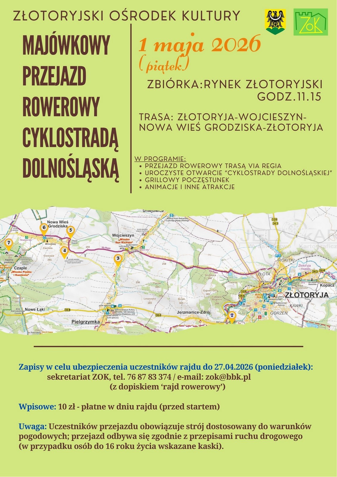 Zbiórka o godz. 11:15 na Rynku Złotoryjskim. Wspólnie pojeździmy trasą Via Regia przez Wojcieszyn i Nową Wieś Grodziska z powrotem do Złotoryi – łącznie ok. 20 km. W programie uroczyste otwarcie Cyklostrady Dolnośląskiej, grillowy poczęstunek oraz animacje i atrakcje dla wszystkich uczestników. Wpisowe: 10 zł, płatne w dniu rajdu. Zapisy do 27 kwietnia w sekretariacie ZOK (tel. 76 87 83 374, e-mail: zok@bbk.pl) z dopiskiem „rajd rowerowy".