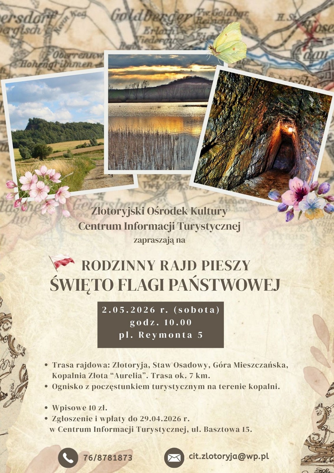 Start o godz. 10:00 z pl. Reymonta 5. Trasa rajdu prowadzi przez Staw Osadowy, Górę Mieszczańską aż do Kopalni Złota „Aurelia" – łącznie ok. 7 km. Na uczestników czeka ognisko z poczęstunkiem turystycznym na terenie kopalni. Wpisowe: 10 zł. Zgłoszenia i wpłaty do 29 kwietnia w Centrum Informacji Turystycznej, ul. Basztowa 15 (tel. 76/8781873, cit.zlotoryja@wp.pl).