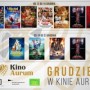 Grafika przedstawia repertuar kina Kino Aurum na grudzień. Układ jest poziomy, z podziałem na dwa tygodnie: od 12 do 16 grudnia oraz od 19 do 23 grudnia. W każdym tygodniu wyświetlone są plakaty filmowe ustawione obok siebie.